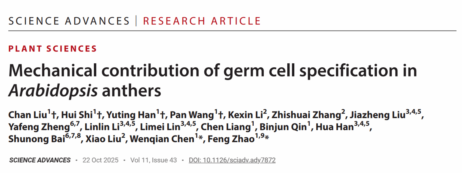 赵峰教授团队联合北京航空航天大学、北京大学及中国科学院自动化研究所多家单位在《Science Advances》发表了题为“Mechanical contribution of germ cell specification in Arabidopsis anthers”的最新原创研究成果。