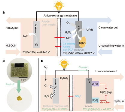 1 (a)自驱动废水电化学提铀工艺; (b)机械剥离法和(c)电极反转制备铀产品示意图
